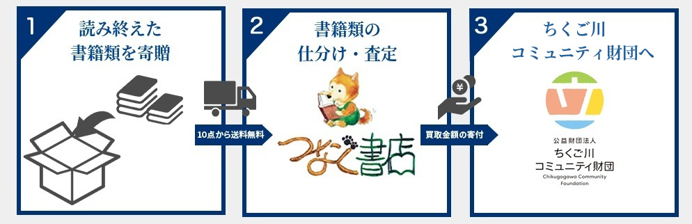 古本募金は皆さまから提供いただいた書籍類(書籍・DVD等)の買取金額が、全額「ちくご川コミュニティ財団」への寄付金となる仕組みです。